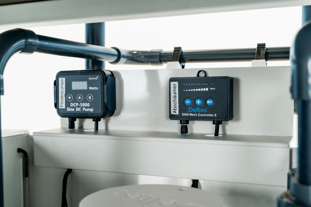Von der Medienfilterkammer fließt das gereinigte Wasser dann in die Kammer mit der Förderpumpe. Die Förderpumpe befördert das gereinigte Wasser anschließend zurück ins Aquarium. Sowohl die Rückförderpumpe als auch die Abschäumerpumpe sind stufenlos regelbar und laufen sehr geräuscharm. Ein integrierter Nachfüllvorratstank mit Nachfüllautomatik sorgt dafür, dass Ihr Aquarium stets mit frischem Osmosewasser versorgt wird.