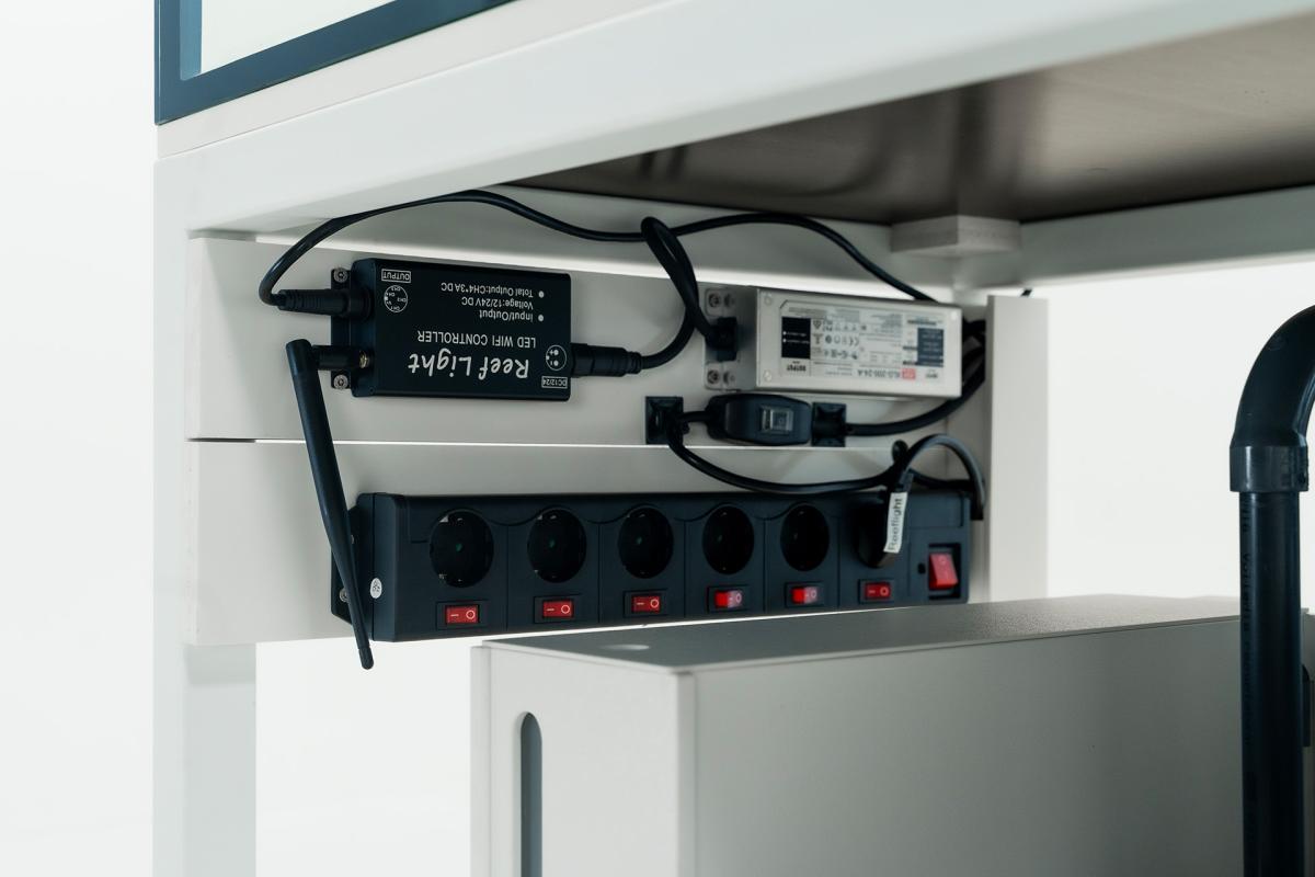 Die Controller der Marine Box sind bequem an der Oberseite der Marine Box angebracht, so dass Sie sie einfach erreichen und bedienen können. Alle Kabel sind sauber verlegt und die Netzstecker sind beschriftet. Die Marine Box ist aus robustem PVC gefertigt und verfügt über eine klar sichtbare Frontplatte. Auch die Abdeckungen bestehen aus durchsichtigem PVC, so dass Sie den Filtervorgang jederzeit beobachten können.