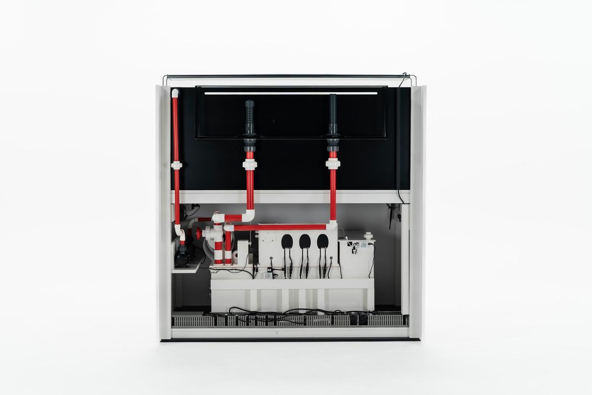 Die Schwachstellen anderer Systemaquarien wie: nicht aufeinander abgestimmte Technik, rostende Scharniere, aufgequollenes Holz und laute Ablaufgeräusche wurden in der Planung dieses Systemaquariums in den Fokus genommen, um diese Fehler bereits von Beginn an auszuschließen und dem Kunden ein System an die Hand zu geben, welches einfach funktioniert.