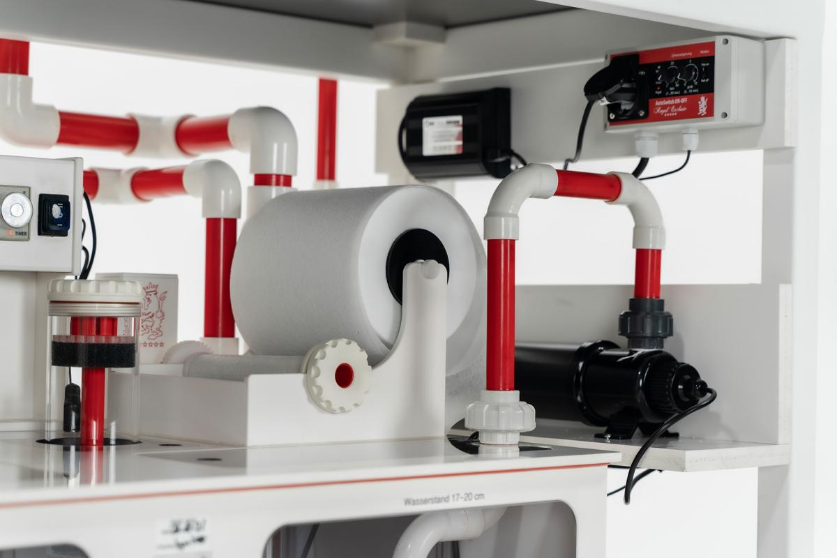 Jedes System verfügt über einen Rucksacküberlauf von 10 cm Tiefe und 30 cm Höhe. Die Länge richtet sich nach der Länge des Aquariums. Auf diese Weise wird eine optimale Oberflächenabsaugung gewährleistet und einer Kahmhaut effektiv vorgebeugt.