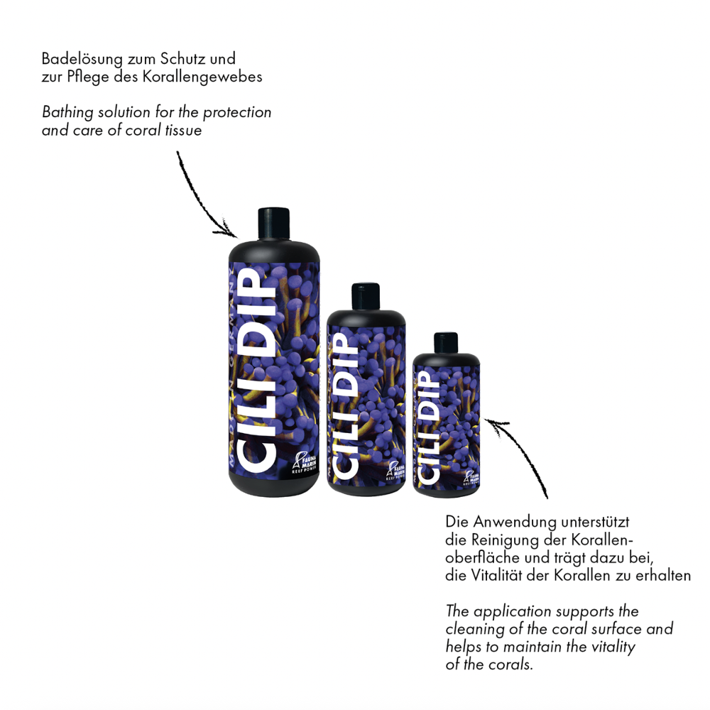 CILI DIP entfernt schonend unerwünschte Parasiten wie Ciliaten (Wimperntierchen), Bakterien, sowie Algen, ohne das empfindliche Korallengewebe zu schädigen. Beim Vorliegen einer RTN/STN-Infektion kann das Bad auch zum Reinigen von Gewebsverletzungen eingesetzt werden.