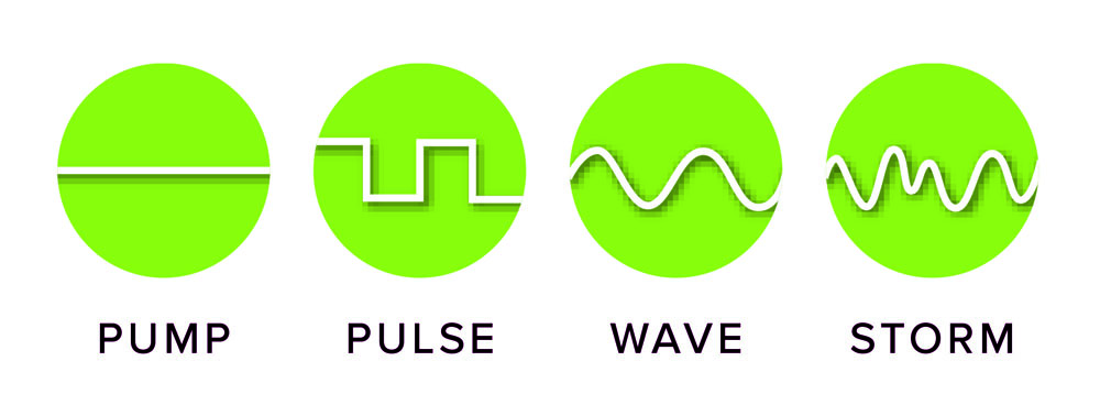 Die Drehzahl der Pumpe wechselt zwischen einer niedrigen und einer hohen Leistungseinstellung und kann zur Erzeugung einer stehenden Welle verwendet werden. Die Frequenz- und Leistungseinstellungen können am Controller geändert werden.