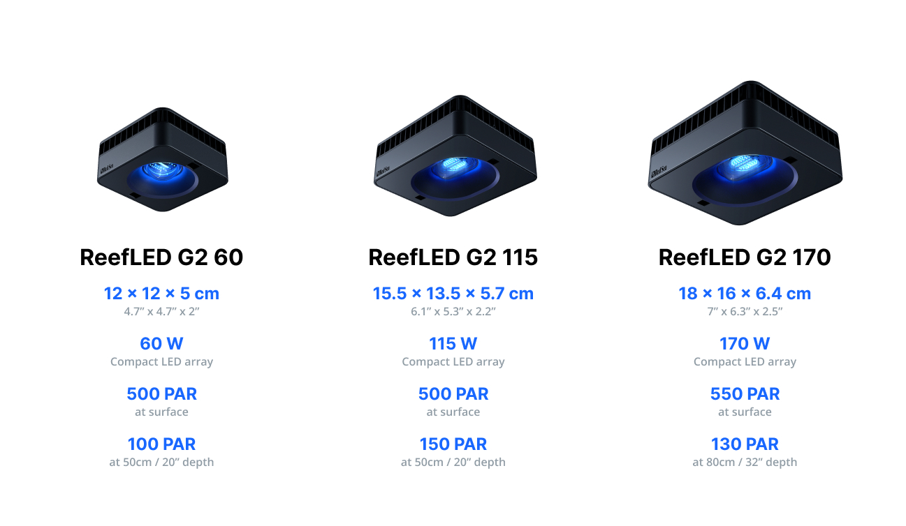 Lernen Sie die zweite Generation der ReefLEDs kennen: Die ReefLED G2 60, die ReefLED G2 115 und die ReefLED G2 170 bieten mehr Leistung, mehr Glanz und mehr Optionen.