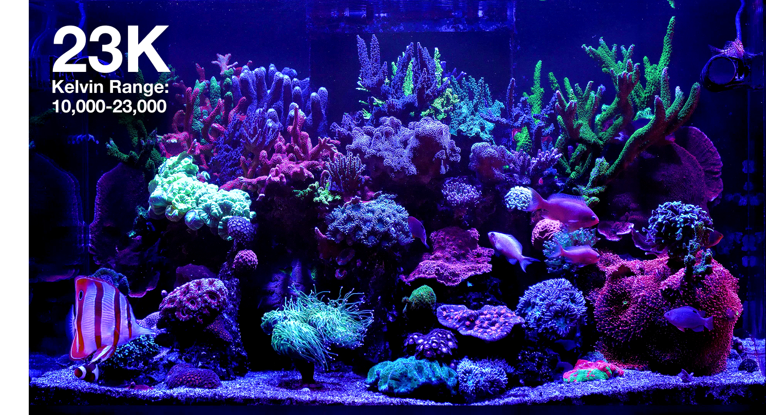 Die ReefLED G2 profitieren von einem völlig neuen Chipsatz in ihren kompakten Arrays, der ein reichhaltigeres Spektrum liefert, und dank ihrer neuen Energieverwaltungsfunktion können sie von 10.000 K Riffweiß auf 23.000 K Blau eingestellt werden, alles bei voller Intensität , was in G1 nicht verfügbar war.